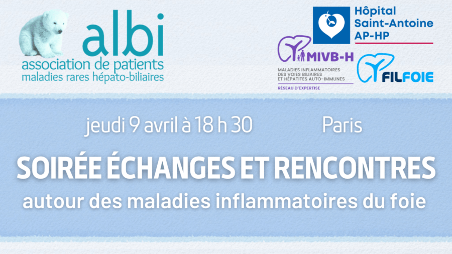 Le Service d’hépatologie de l’Hôpital Saint-Antoine à PARIS, Centre de Référence Coordonnateur national du réseau des Maladies Inflammatoires des Voies Biliaires et des Hépatites Auto-Immunes ( MIVB-H), et notre association albi, organisent conjointement, une soirée échanges et rencontres autour des maladies inflammatoires des voies biliaires et des hépatites auto-immunes : Cholangite Biliaire Primitive (CBP), Cholangite Sclérosante Primitive (CSP), Hépatite Auto-Immune (HAI), et du syndrome LPAC…